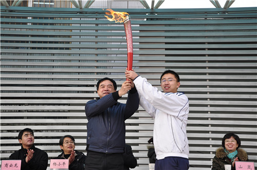 接着,校党委副书记兼副校长任新钢老师点燃了象征着 “一二·九”运动革命精神传承的火炬,并亲手将火炬授予由我校优秀研究生党员、优秀研究生、优秀研究生干部组成的模范方队。熊熊燃烧的火炬在模范方阵的护送下,在全场观众的热烈欢呼中,沿校园传递。