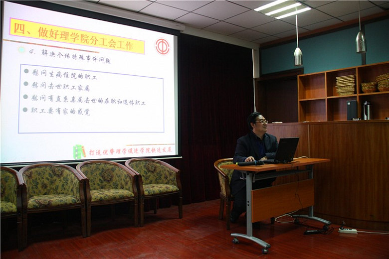 靳万民副主席在致辞中指出,做好学院工会工作,对于构建和谐校园、维护稳定、服务学校具有重要意义,并充分肯定了理学院分工会在服务大局、维护教职工合法权益、加强学校民主建设、关心教职工生活、丰富校园文化生活等方面所做的工作。李殿卿院长对本年度理学院在科研、教学、学科建设以及学生工作中取得的成绩进行了总结汇报,同时将学院的财务收支情况向各位工会委员及小组长进行了通报。