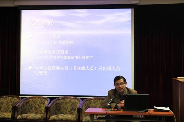 苏建茹副主席首先对宣传员们一年来的工作表示了肯定和感谢,同时希望大家在新时期新形势下继续为教职工做好服务。校计划生育办公室主任张立新作了2010年计划生育工作总结,并就计划生育政策和工作流程进行了培训。之后校党委副书记王同奇针对目前计划生育工作的新特点、新问题进行了深刻分析,并就新形势下如何做好计生工作提出了思路和想法。他强调指出:计划生育是我国的基本国策,希望各位计生委员和计生宣传员要结合本单位具体情况,进行耐心细致的工作,更好地完成我校的计划生育工作任务。
