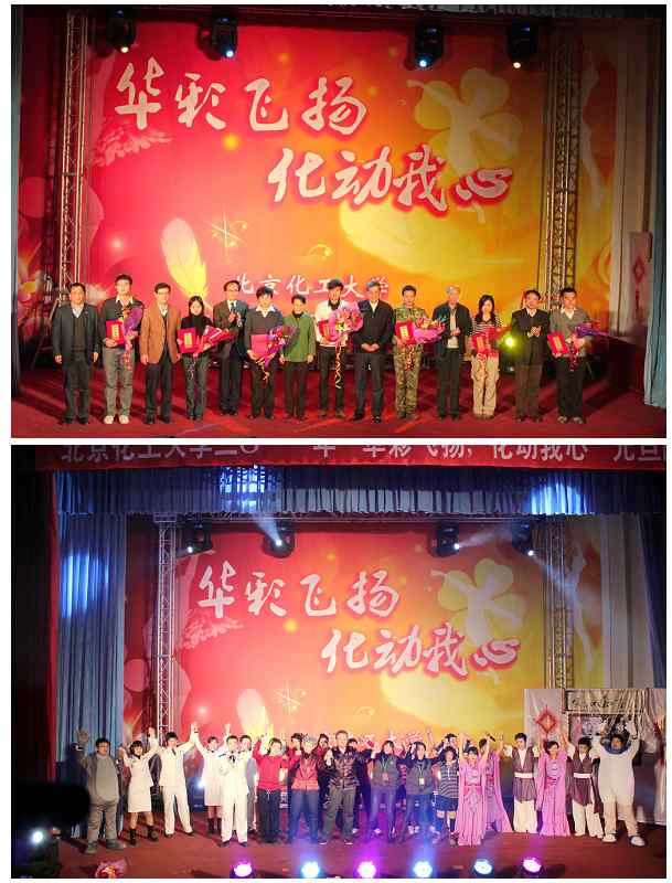 在一段精彩的2010年回顾视频后,充满朝气的歌舞《旗开得胜》正式拉开了晚会的序幕。随后,柔美和竞技完美结合的健美操表演,富有民族韵味的民族舞串烧,幽默诙谐、贴近生活的现代相声《学电台》等让师生们目不暇接;十佳教师代表姚望老师带来的倾情演唱、校园十佳歌手们的歌曲串烧和扣人心弦的近景魔术将观众的激情一次次点燃。此外,小品《红花绿叶》凸显了院周工作的主题,表达了广大学子对学校和专业的热爱;《爱的阳光》体现了和谐温馨的校园文化,表达了同学们对家人、学校领导、教职员工和同学朋友深深地感恩之情;辅导员节目《一号楼的一家人》以人口普查中普通家庭的一段家事为主线,彰显了当代青年积极向上、勇担重任的精神风貌,充分表达了我校师生对祖国的祝福和热爱。晚会中,舞台剧《凡星耀北化》以校园广播609在线的形式,现场再现了我校平凡学子中的优秀事迹,褒扬充满理想、奋勇拼搏的新一代大学生的精神风貌,校领导亲自上台为成才表率闫东鹏、无名英雄王占元、勇斗强盗的王海涛和杨燕、见义勇为的吴宏成、勇抓盗贼的张亚丽、亚运明星史博和军旅标兵杜湖泽等同学颁发了证书。