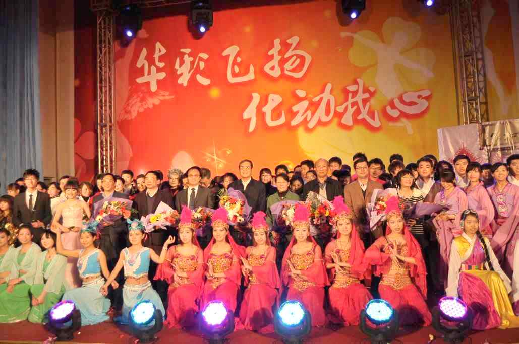 演出结束后,校领导上台与演职人员亲切握手并合影留念。本次晚会主题鲜明,精彩纷呈,充分表达了我校师生对祖国的祝福和对学校的热爱,进一步彰显了我校师生青春活力和积极昂扬的精神风貌。相信在全体师生的共同努力下,我校在2011年将会取得更加辉煌的成绩!(北区办供稿)
