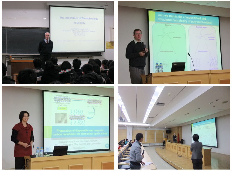 3月22日上午,来自澳大利亚最大的国家级科研机构——联邦科学与工业研究组织( CSIRO )的两位著名学者——Tim教授和郝晓娟博士应邀来我校作学术报告。生命学院副院长苏海佳老师主持了本次报告。Tim教授就RAFT法合成高分子糖类聚合物的过程做了详细介绍,而郝晓娟博士则向大家讲述了如何制备用于生物医疗的磁性碳纳米管以及各方面特征的检测,同学们对此兴趣盎然,向老师请教了很多学术问题,形成了十分活跃的互动场面。报告结束后Tim教授和郝晓娟博士还来到实验室针对同学们的实验情况进行了耐心的指导。