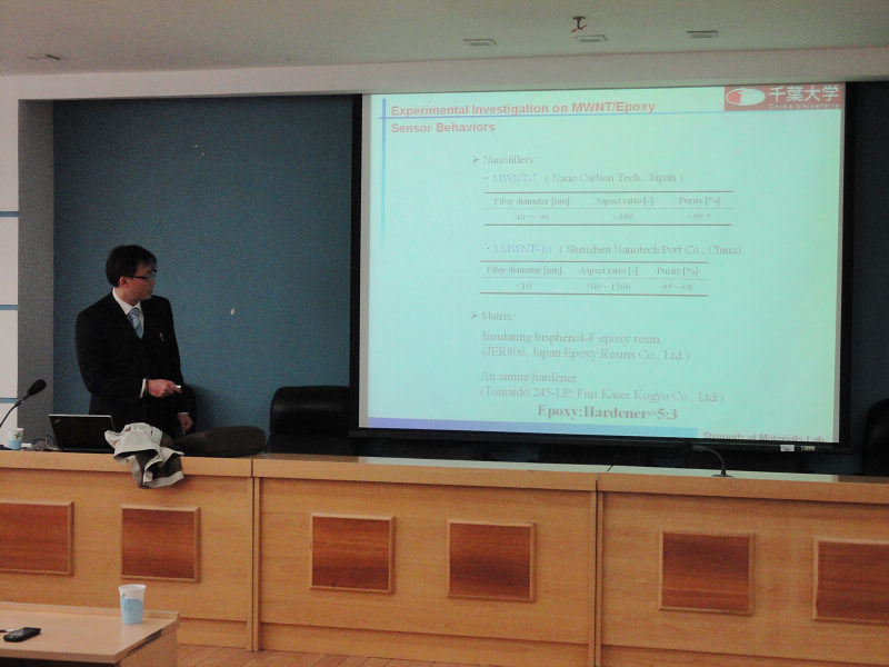 3月28号上午,日本千叶大学的胡宁教授在我校会议中心/中心会议,就利用纳米碳管复合材料所开发的超高灵敏度电阻型应变传感器高出普通应变片进行了讲座。这类应变传感器属于世界最高水平,所开发的利用LAMB波在线对结构物进行损伤监控的系统已趋于成熟,所开发的利用激光激振的超声波传播可视化系统和快速扫描损伤检查与图像构造系统已接近实用化。
