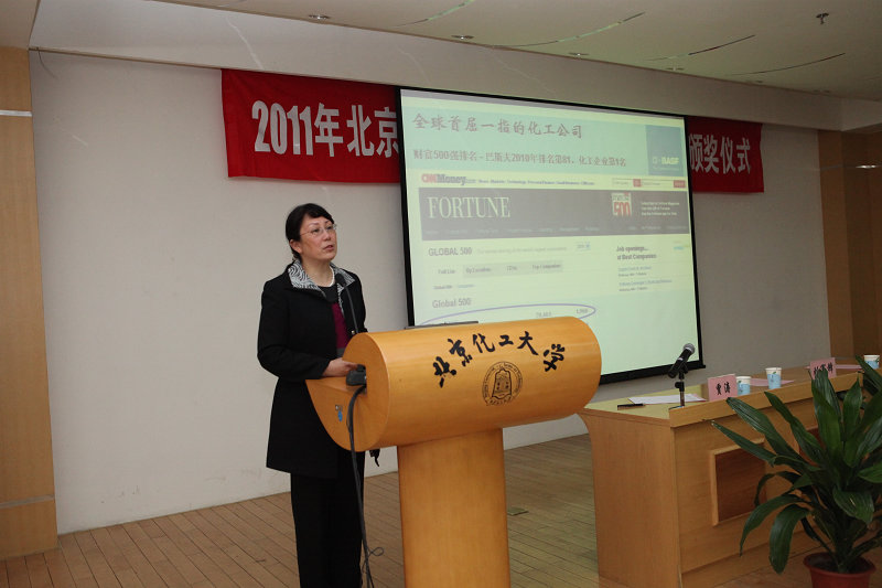 仪式结束后,刘江永同学分享了他参加2010年巴斯夫暑期夏令营的心得体会。最后,巴斯夫公司马莲博士从企业概况、企业理念、用人要求等方面做了精彩的宣讲报告,并和同学们进行了互动。颁奖仪式在热烈的气氛中结束。