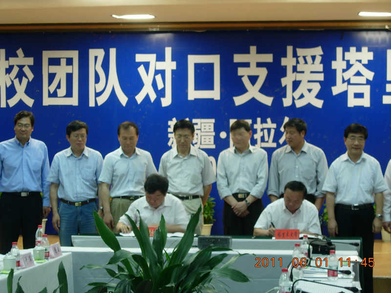 会上,新疆生产建设兵团教育局张爱龙副局长对一年以来新疆高等教育的建设与发展情况进行了总结,塔里木大学王合理校长对下一阶段对口支援的工作计划进行了说明,各支援高校分别就本单位对口支援工作的进展情况进行了汇报。受学校领导委托,屈一新书记向大会汇报了我校对口支援工作的进展与成果,并代表学校与塔里木大学签订了本科生联合培养协议。
