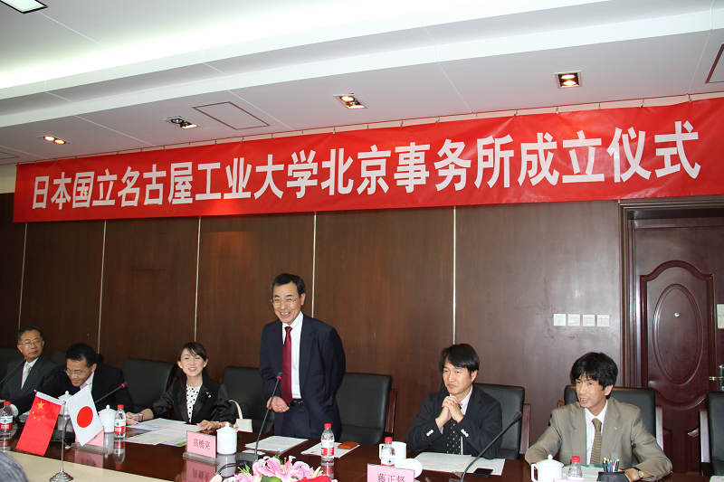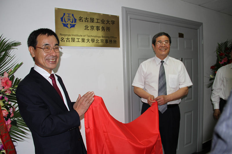 高桥校长在回顾了名古屋工业大学的办学理念以及国际交流工作的开展,着重介绍了与中国大学特别是与北京化工大学的合作,阐述了成立北京事务所的必要性以及事务所的使命,并感谢北京化工大学对其事务所成立的大力支持。王子镐校长对名古屋工业大学北京事务所的成立表示祝贺,并祝愿其成立能够进一步加强名工大与中国高校的合作,并期待能在今年赴日完成北京化工大学驻日联络办公室的成立。仪式结束后,两位校长在科技大厦“日本名古屋工业大学驻京事务所”门前举行了揭牌仪式。