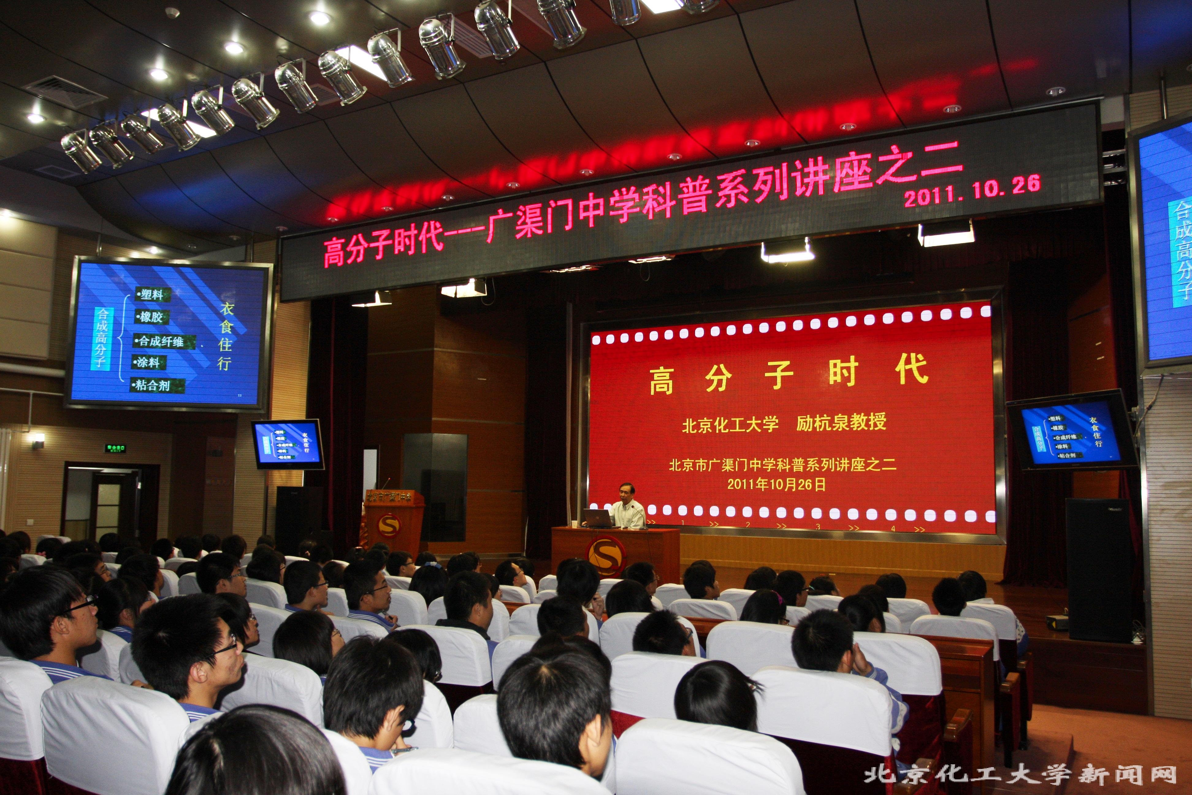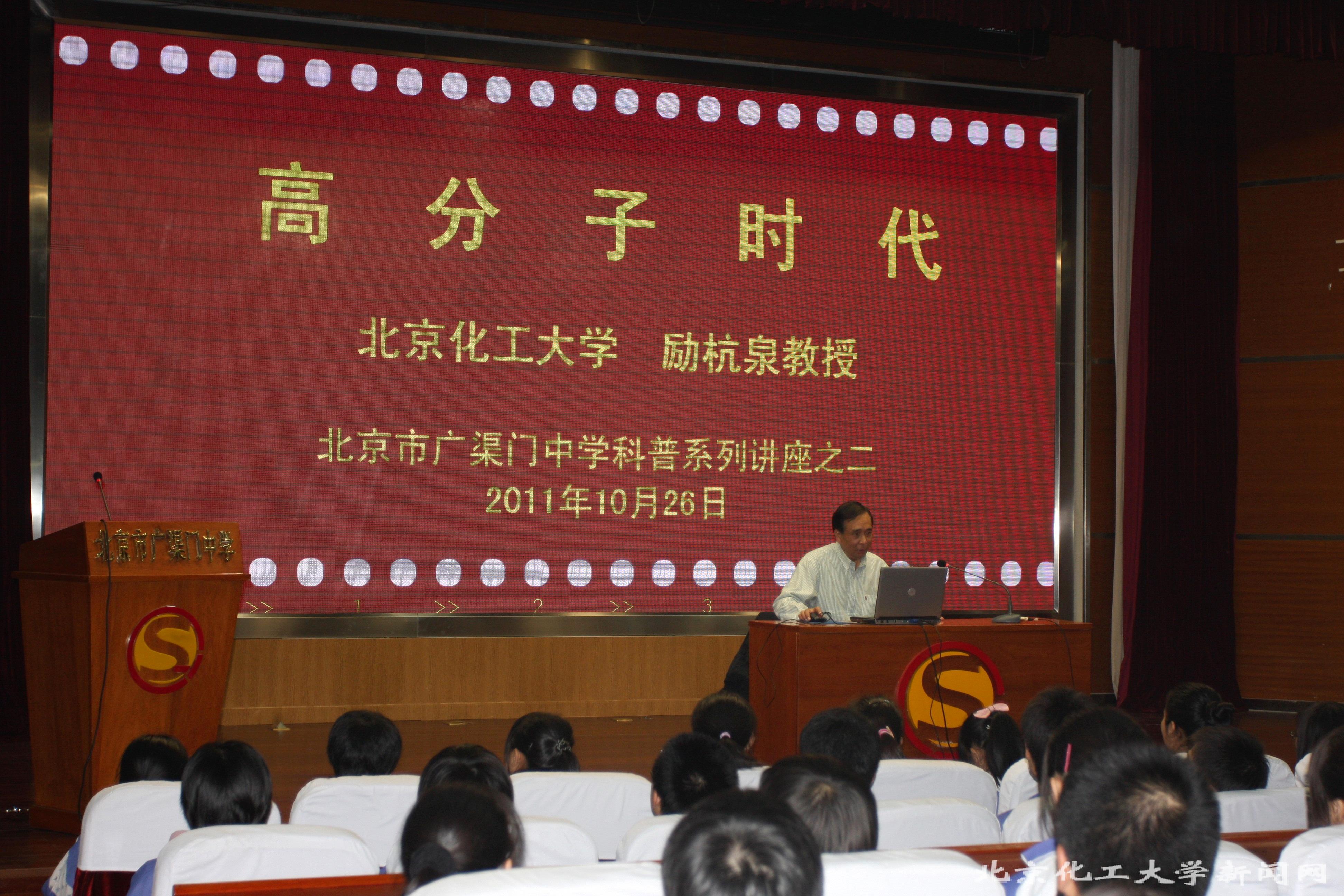 10月26日下午,应北京市广渠门中学“翱翔论坛”邀请,我校材料科学与工程学院励杭泉教授来到广渠门中学,为同学们作了题为“高分子时代”的中学科普讲座。励杭泉教授引用同学们身边的大量实例,介绍了高分子材料在日常生产、生活中的应用,并展望了高分子材料的未来前景。讲座内容丰富、深入浅出,同学们听得津津有味。讲座使中学生初步了解了高分子材料学科领域的内涵,对高分子材料领域产生了极大兴趣。