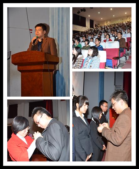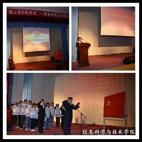 下午15:00活动正式开始,全体起立奏唱国际歌。大会进入第一项——宣读志愿书及入党宣誓;两位2010级新党员现场向党组织宣读了自己的入党志愿。随后,他们与2011级所有新生党员一起,在正式党员的带领下面向党旗庄严宣誓。大会第二项是优秀学生党员主题发言,两位学生党员围绕会议主题分别讲述了他们作为党员在大学生时期的成长事迹,表达了对党的忠诚和对学生党员的理解。