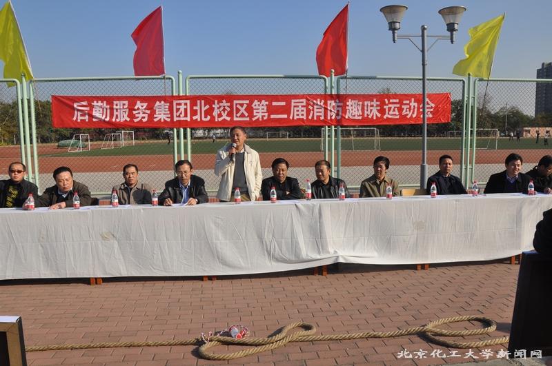 郭奋主任致开幕辞,祝贺后勤集团消防运动会的召开,后勤职工消防趣味运动会将进一步提高大家的消防安全意识,营造和谐、安全的北校区教学、生活环境。在消防演习讲评中,许运清处长充分肯定了后勤集团在学校安全管理工作中所做出的贡献。后勤集团赵恩平总经理宣布消防运动会开幕,裴永昕书记为获奖集体颁奖。