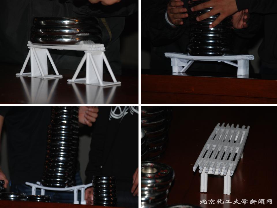 理学院“纸桥承重大赛”作为“院周”的特色活动之一创办于2007年,经过几年的传承与发展,比赛规则和组织工作得到不断完善,已逐步成为了深受广大同学喜爱的学院品牌学生活动之一。本年度该项赛事扩大规模,邀请同在昌平的其他四所兄弟院校共同参与举办。比赛的规则是每支队伍最多使用20张A4纸,通过裁剪、折叠、普通胶水粘贴等多种方式制作纸桥,作品平放时桥面最低处距地面不少于5cm,两桥墩的最近距离不少于20cm,纸桥全重不超过100g。