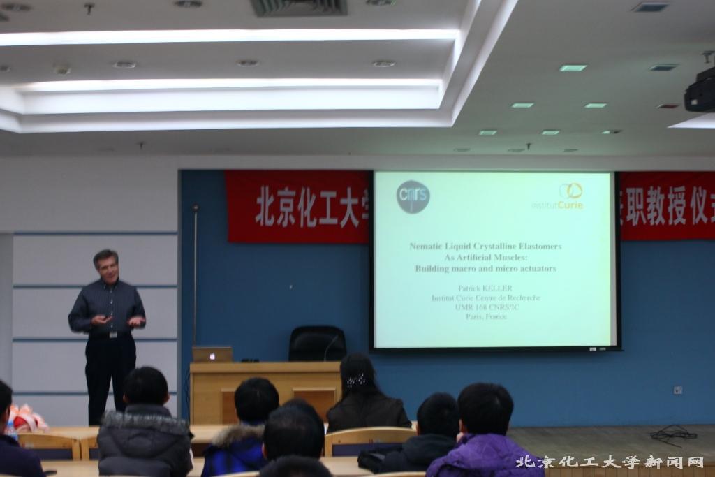 仪式结束后,Patrick Keller教授做了题为“Nematic Liquid crystalline elastomers as artificial muscles: Building macro and micro actuators”的学术报告。报告介绍了液晶材料作为人造肌肉研究发展历史及现状,展示了其课题组液晶材料所特有的磁感应性、光感应性以及温度敏感等性质,提出了该类液晶材料在生物模拟材料领域的应用前景。