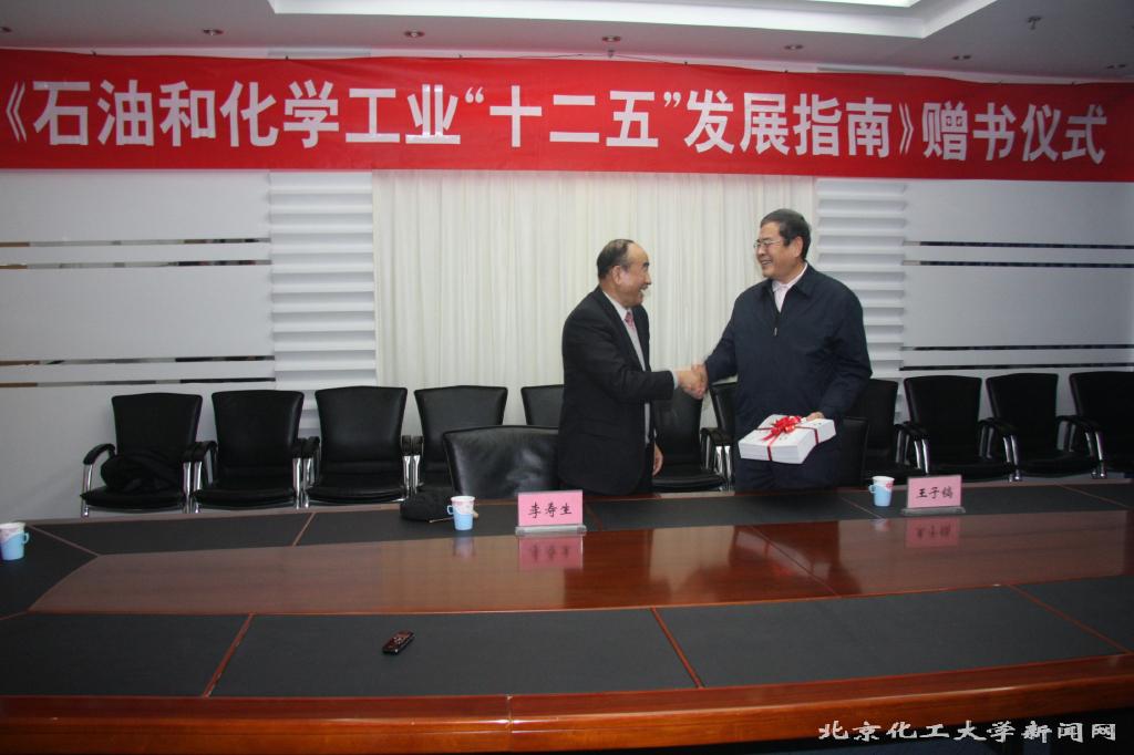 报告会前,王子镐校长与李寿生副会长进行了亲切交谈。双方就如何培养拔尖创新人才、学科建设以及保持我校在石化领域的领先优势等问题交换了意见。会谈结束后,李寿生副会长向我校赠送了石油化工出版社出版的《石油和化学工业“十二五”规划》一书。