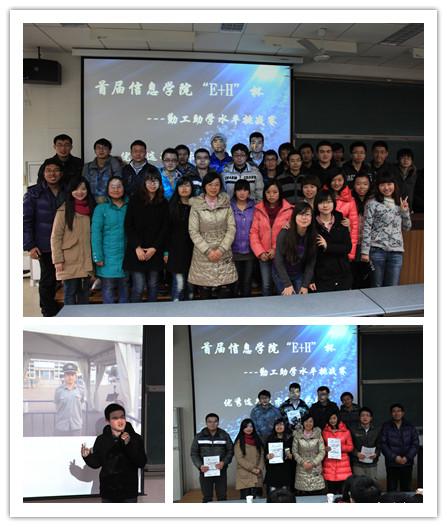 12月19日下午,信息学院首届“E+H杯”勤工助学水平挑战赛优秀选手展示暨颁奖典礼在科技楼举行。信息学院党委副书记汪雪琴,09级辅导员及获奖同学共130余人出席了仪式。