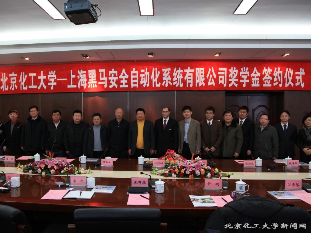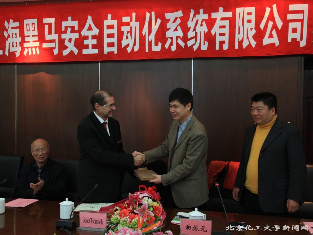 12月21日上午,北京化工大学——上海黑马安全自动化系统有限公司奖学金签约仪式在我校行政楼203会议室举行。我校出席仪式的有副校长陈冬生,校办主任王玉,学生工作办公室主任罗伟,高新技术研究院院长屈一新,信息学院院长朱群雄,信息学院党委书记李征,副院长王建林、李宏光,信息学院党委副书记汪雪琴及部分教师和学生代表。企业出席仪式的有德国黑马安全自动化系统有限公司研发副总裁Josef Borcsok先生,上海黑马安全自动化系统有限公司总经理曲振元、副总经理孙卫东、销售总监张海波以及市场经理许鹏。仪式由汪雪琴老师主持。