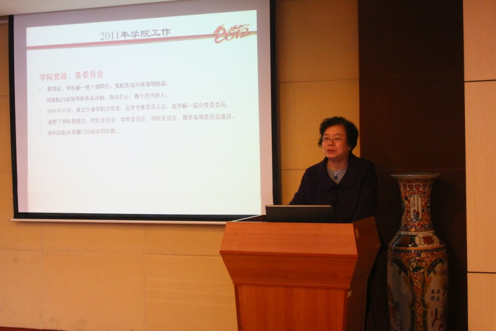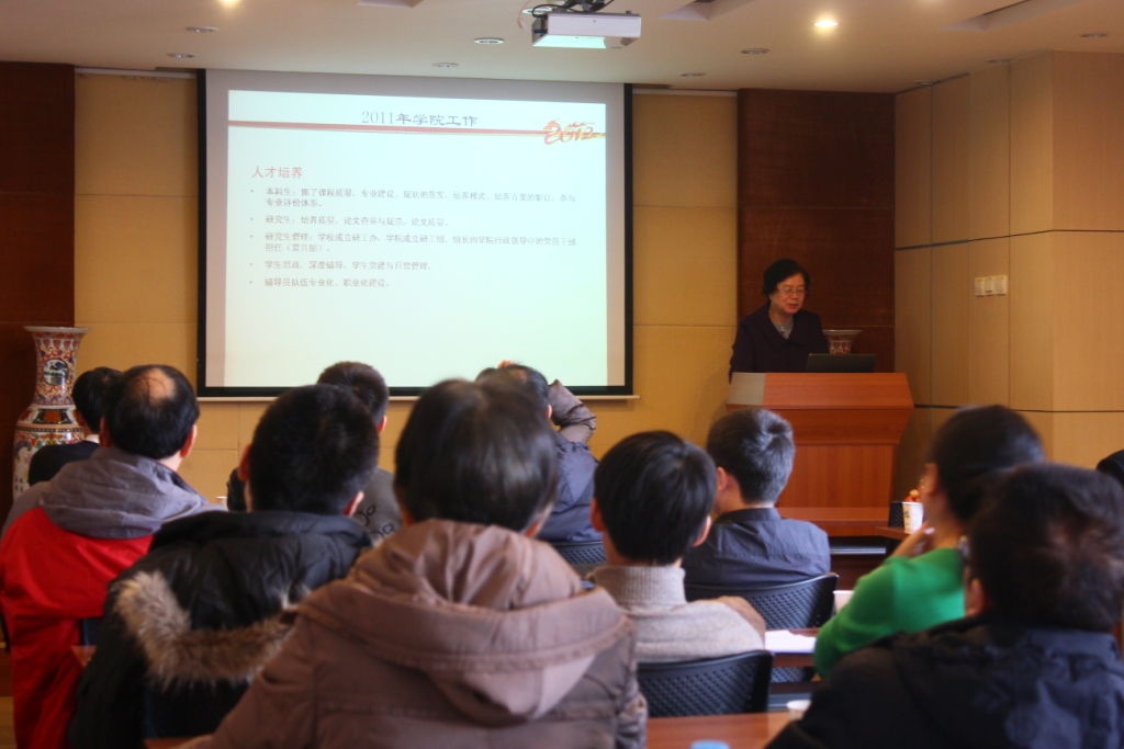 会上,学院党委书记张丽叶,副院长杨晶、邓利、刘军锋分别就2011年分管的工作进行了总结,并对2012年的主要工作进行部署。最后,学院张丽叶书记代表学院党政领导感谢一年来为学院发展做出不懈努力和贡献的全体教职员工,并祝老师们新年快乐。
