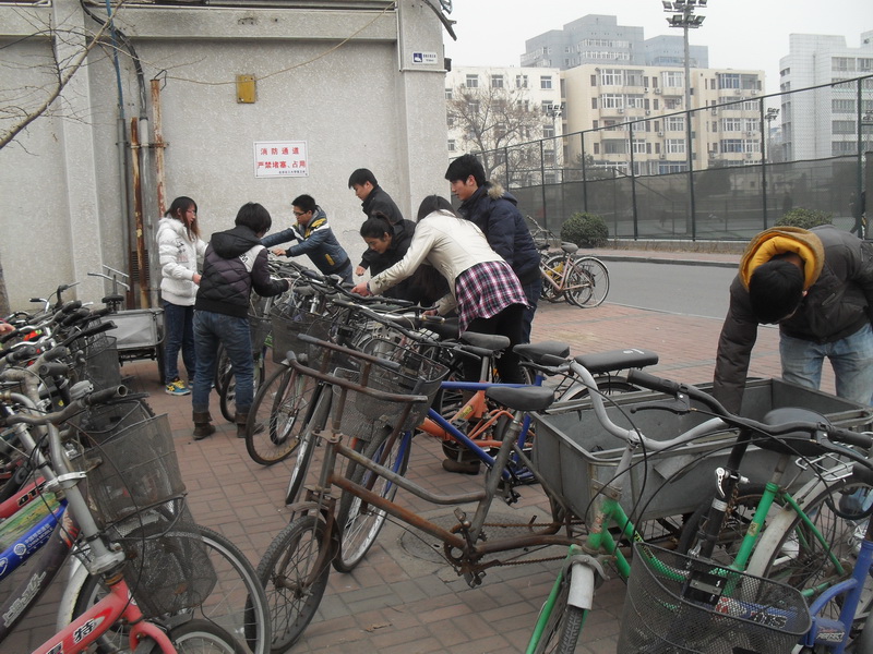 在校园里整理自行车