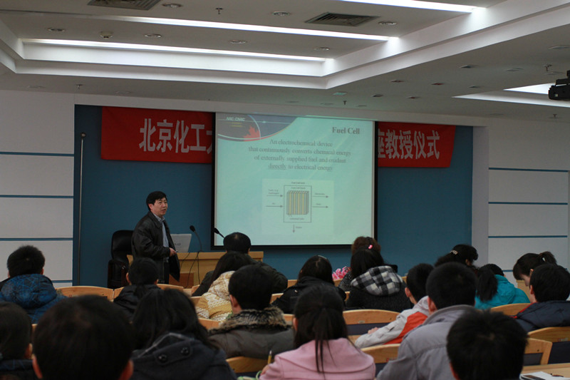 聘任仪式结束后,王海江研究员作了题为“PEM Fuel Cell Chloride Contamination——Impacts and Mechanism”的学术报告。他从燃料电池的工作原理说起,介绍了燃料电池与氯碱工业结合,有效利用氯碱工业中的副产物氢气做燃料发电的优势及目前面临的瓶颈,详细探讨了氢气中微量氯离子对燃料电池性能的影响及有关机理。
