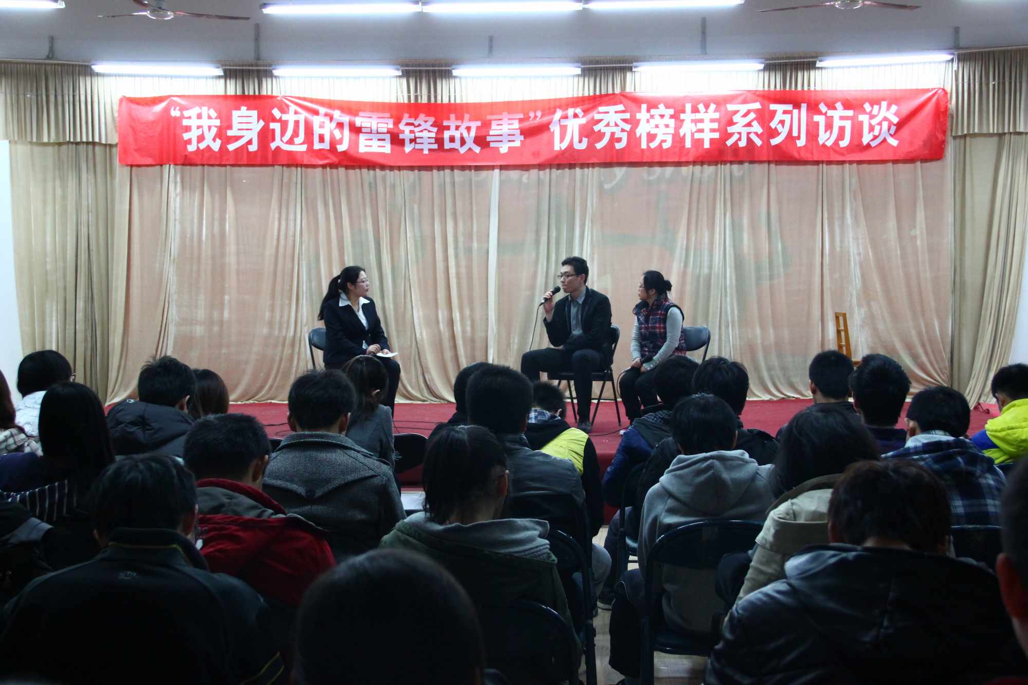 3月26日晚,由校团委、学生会主办的“我身边的雷锋故事”优秀榜样系列访谈之“爱岗敬业”专场在东校区大学生活动中心举行。本次访谈邀请了段鹏、贺美玲两位嘉宾参加访谈。