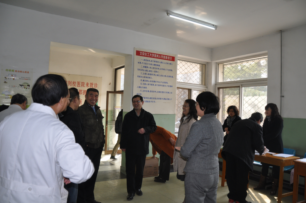 3月26日,学校党委副书记、工会主席王同奇和副校长李显扬在校工会常务副主席苏建茹、后勤服务集团总经理赵恩平及校医院负责人陪同下,看望了工作在校医院一线的医务人员和正在体检的教职工,给他们送去亲切的问候,并仔细询问了目前检查的情况。医务人员和各位老师对学校的关心表示感谢。