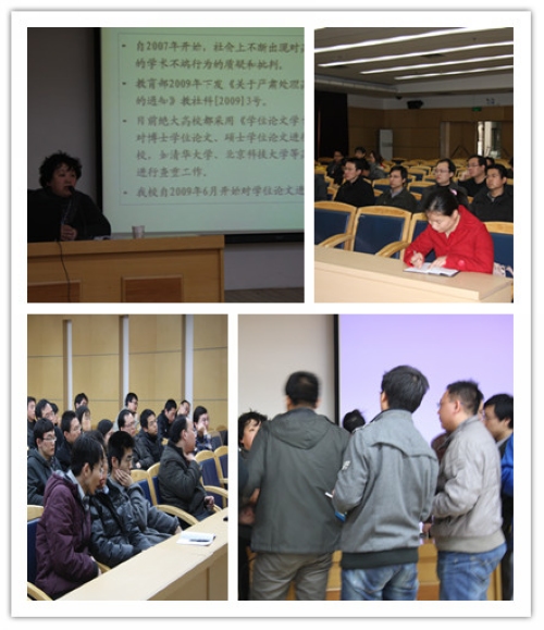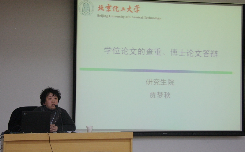 贾梦秋副院长传达了国家对科学道德和学风建设的高度关注,重申了北化大校发[2011]5号文件《北京化工大学研究生学位论文抽查审核实施办法》的要求,并就2012年博士毕业生论文查重及答辩工作做了具体部署。重点对论文抄袭、剽窃等行为的界定,学位论文查重的原则和常见问题,以及申诉程序等内容做了详细说明,并对博士生关心的热点问题进行了详细的解答;同时提醒博士生要高度重视,明确学位论文规范,认真应对学位论文查重、盲评、答辩等具体工作。
