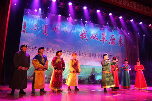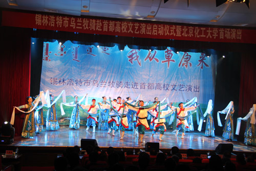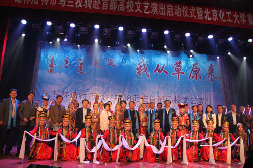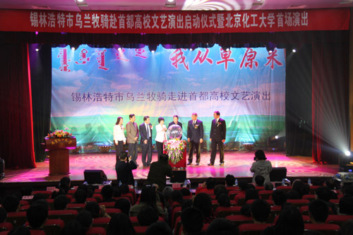 4月8日晚,“我从草原来”——锡林浩特市乌兰牧骑赴首都高校文艺演出启动仪式曁北京化工大学首场演出在我校科学会堂隆重举行。北京市教委副主任郑萼,市教委体美处副处长王军,内蒙古自治区党委组织部副部长王喆,锡林浩特市委书记张晓兵、市长闫宏光,锡林浩特市委、市政府、市人大、市政协相关领导,北京化工大学副校长李显扬出席,学工办、材料学院、北区办、团委相关负责人,各学院学生工作负责人以及兄弟院校代表参加。