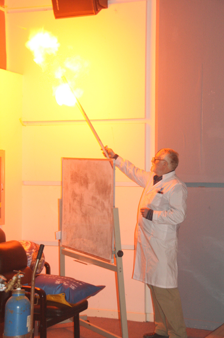 Professor David Evans, the chairman of the Royal Society of Chemistry Beijing Local Section, is giving a lecture on "Chemical Magic" for pupils from migrant schools at Beijing University of Chemical Technology on April 21, 2012. [Photo/chinadaily.com.cn/Huang Shuo]