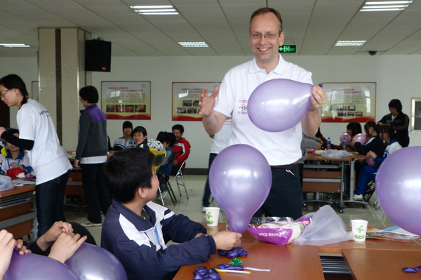 Professor Richard de Grijs, the representative of Institute of Physics for China, is doing physics experiments with pupils from migrant schools at Beijing University of Chemical Technology on April 21, 2012. [Photo/chinadaily.com.cn/Huang Shuo]