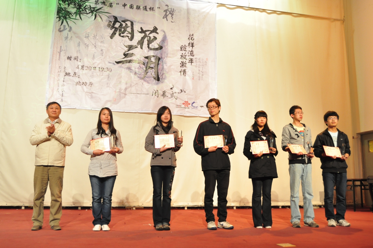 主持人介绍了本届“烟花三月”大学生风采展示活动的开展情况后,会场播放了本次活动的获奖作品展示,并揭晓了获奖者名单。郭奋老师和于景华老师先后为文字类和图片类获奖者颁奖。闭幕式中还穿插了精彩的魔方表演、神奇的魔术表演、获奖作品《青春宣言》的朗诵等节目,在两位校园十佳歌手的甜美歌声中,本届“烟花三月”大学生风采展示活动圆满落下帷幕。