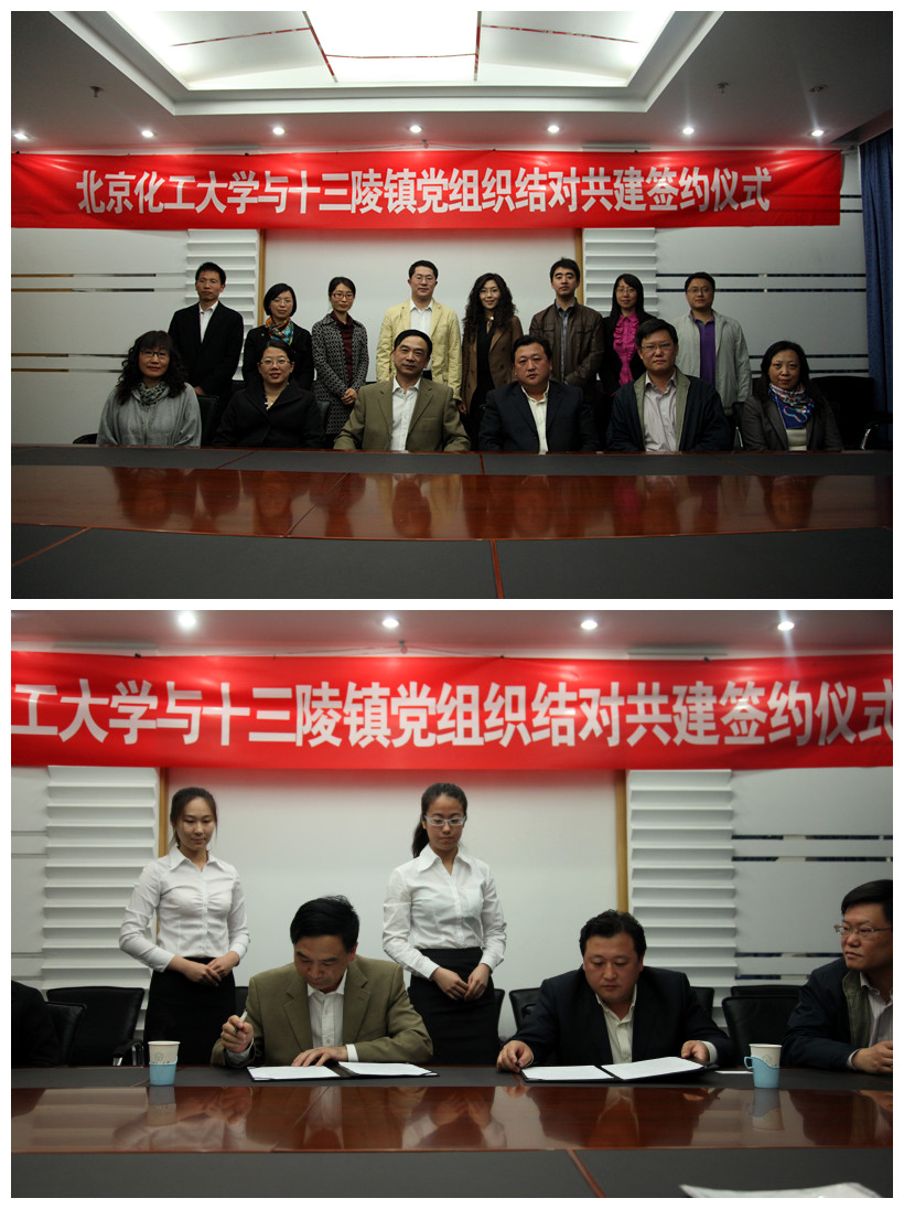 任新钢副校长与王建成书记签署了我校与昌平区十三陵镇党组织开展结对共建的协议书。罗伟主任总结了2011年我校开展红色“1+1”活动情况、布置了2012年相关工作。与会领导为我校2011年红色“1+1”活动获奖党支部颁发证书。秦兴秋副部长和王建成书记先后致辞。任新钢副校长为新结对单位代表授牌,并为作为示范项目教工党支部的先进弹性体研究中心教工党支部授旗。我校共建单位代表为国旗护卫队党支部等8个作为示范项目的学生党支部授旗。