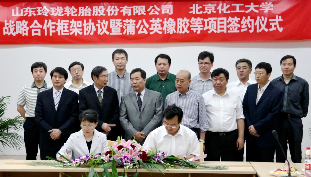 5月9日,山东玲珑轮胎股份有限公司-北京化工大学战略合作框架协议暨蒲公英橡胶等合作项目签约仪式在逸夫会议中心多功能厅举行。北京化工大学党委书记王芳,中国石油和化学工业联合会副会长周竹叶、副秘书长胡迁林,中国橡胶工业协会会长范仁德,山东玲珑轮胎股份有限公司董事长王锋,北京化工大学科技处处长曹兵、高新技术研究院院长屈一新、材料学院院长杨万泰,以及双方项目合作人员出席了签约仪式。