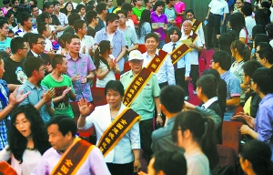 在北京化工大学的礼堂里,师生们起立鼓掌欢迎全国道德模范入场巡讲。本报记者 饶强摄