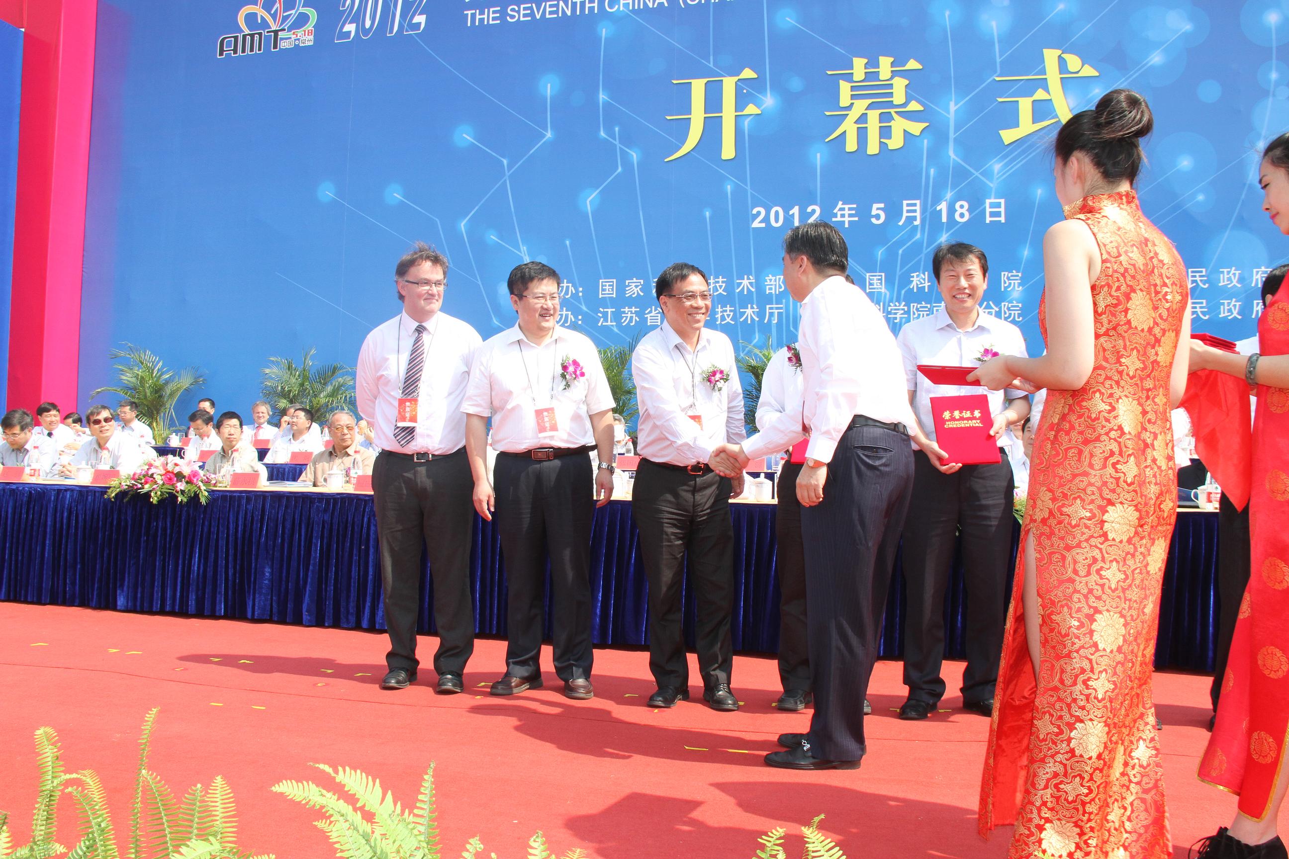 由科技部、中科院和江苏省人民政府主办的2012第七届中国常州先进制造技术成果展示洽谈会于5月18日在常州开幕,高校院所领导及专家教授、国外科研机构代表、企业代表近3000人出席开幕式,其中包括诺贝尔奖获得者4名,两院院士、长江学者20多名。我校陈标华副校长、教授代表及常州院科研教师总计26人参加了本次盛会。在开幕式上,我校副校长、常州院院长陈标华教授获得了常州市政府颁发的产学研合作贡献奖。