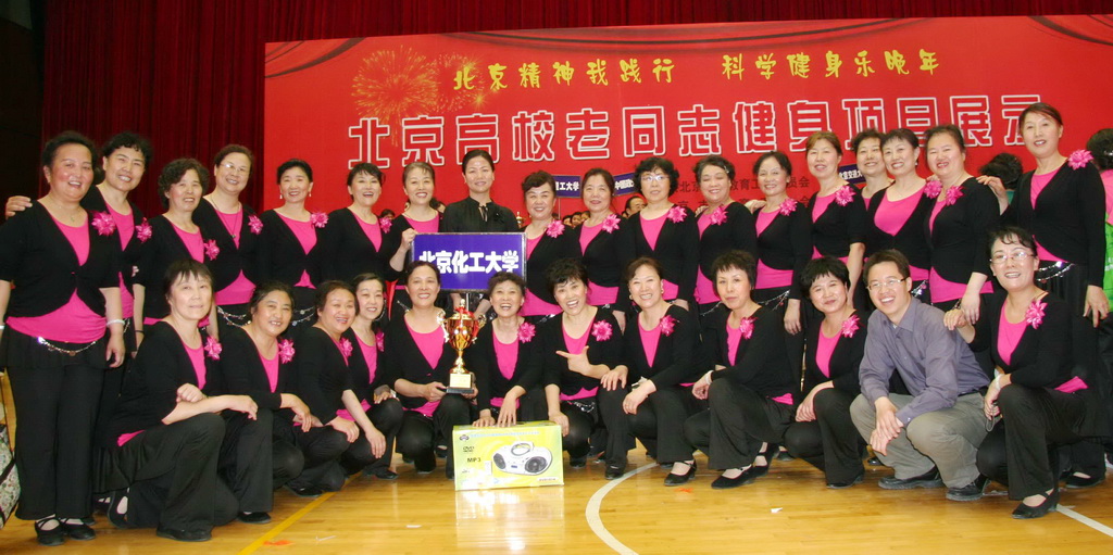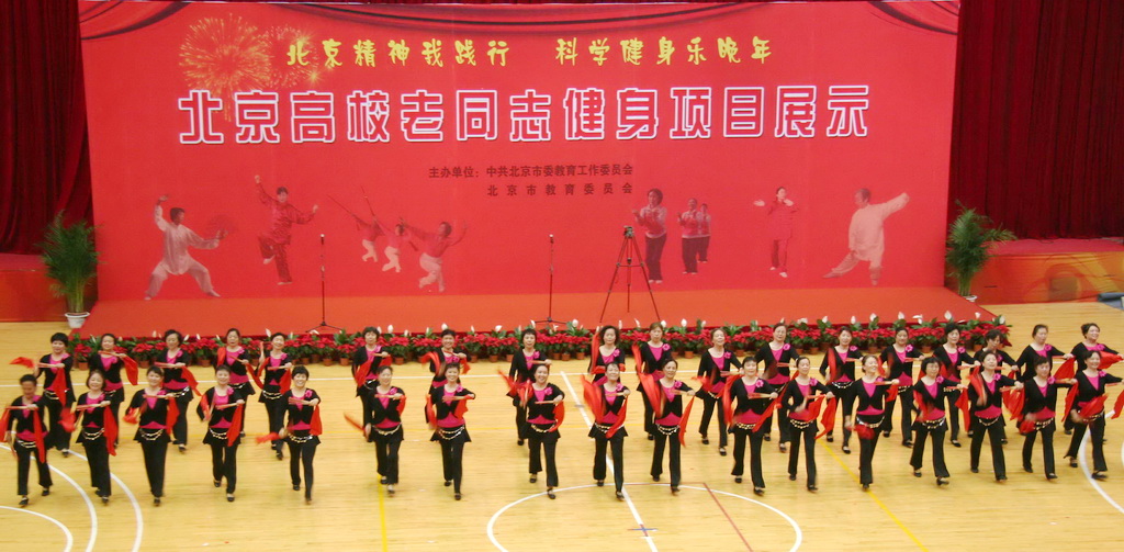 5月22日上午,我校离退休健身舞队50余位老同志参加了在首都师范大学体育馆举行的“北京精神我践行、科学健身乐晚年,北京高校老同志健身项目展示活动”,该活动由市委教育工委、市教委主办。我校离退休健身舞队表演的筷子舞“祝祖国三杯酒”节目,经过精心编排、积极训练、不辞辛苦,以矍铄的精神、整齐的服装、磅礴的气势充分展示了我校离退休老同志积极健康、乐观向上的精神风貌,优美的舞姿和欢快的旋律赢得评委认可,获得展示活动一等奖。