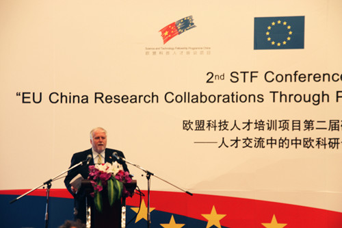 继欧盟科技人才培训项目(STF)第一届会议于2011年3月成功举办之后,第二届研讨会于2012年5月16日在北京举办。会议的主题是“EU-China Research Collaborations through People-to-People Exchange”。150余人出席了会议,包括项目所有学员、欧盟驻华代表团大使及官员、欧盟成员国使馆科技参赞、教育部国际合作与交流司司长张秀琴、外专局文教专家司副司长雷风云以及来自欧洲及其他国家和地区,与中国科研工作和合作有紧密联系的研究学者。在华工作满十六年的我校化工资源有效利用国家重点实验室戴伟教授受到欧盟驻华代表团的邀请主持本次会议。我校副校长陈冬生,国际处处长耿海萍参加了会议。