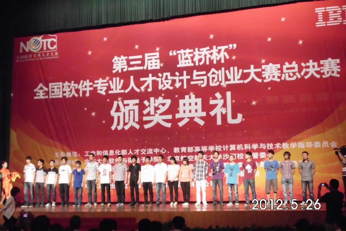 5月26日,第三届蓝桥杯“全国软件专业人才设计与创业大赛”总决赛暨颁奖典礼在北京大学百年纪念讲堂举行。由信息学院教师尤枫和高敬阳率领的北京化工大学代表队在本次大赛中取得了优异成绩。计算机科学与技术专业学生赵旭、黄杨昱、萧碧波和赵雅成获得了总决赛二等奖,陈昊星、徐梓豪和张雨生同学获得了总决赛三等奖。他们是在4月7日举行的第三届蓝桥杯“全国软件专业人才设计与创业大赛”预选赛中获得北京赛区一等奖取得参加总决赛资格。