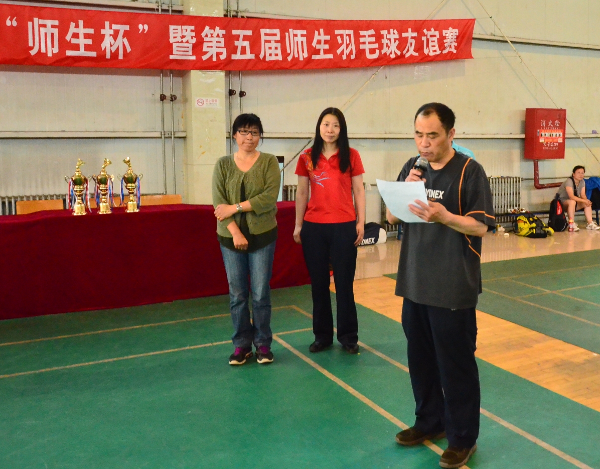 经过了一天的激烈角逐,比赛圆满结束。闭幕式上,北区办副主任于景华致闭幕词。她对参加本次活动的老师和同学们表示感谢,对精心组织此次比赛的各部门表示诚挚的敬意,希望同学们充分利用以球会友的机会,积极营造师生情浓、真情互动的良好氛围。保卫处副处长、教职工羽毛球协会秘书长郭亚臣宣布比赛成绩,国际交流合作处处长耿海萍、校工会专职副主席靳万民、于景华副主任等共同为获奖选手颁奖。