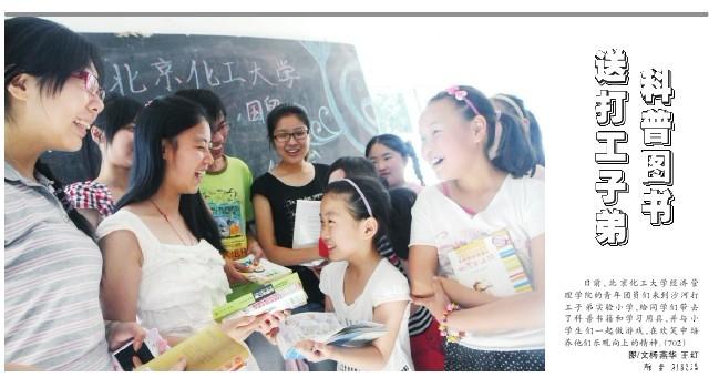 日前,北京化工大学经济管理学院的青年团员们来到沙河打工子弟实验小学,给同学们带去了科普书籍和学习用具,并与小学生们一起做游戏,在欢笑中培养他们乐观向上的精神。