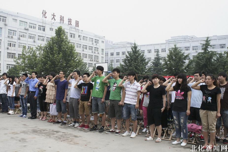 最后,2012届全体毕业生宣誓,庄严承诺将“铭记母校校训,谨遵师长教诲,弘扬化大精神,报效祖国人民。秉承 ‘宏德博学、化育天工’ 的校训,团结奉献、艰苦奋斗、务实力行、博学创新,与时代同呼吸,与祖国共奋进!”