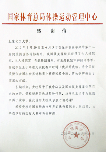 长期以来,贵校给予了我中心以及国家健美操集训队巨大的支持。贵校培养的教练员孙伟庆,运动员王子卓为祖国争得了荣誉,在此谨向贵校表示衷心的感谢!