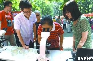 晨报讯(首席记者 王彬)昨天,永外街道举办“党旗下·党员在行动”庆七一活动,永外街道北京化工大学学生党员志愿服务暨社会实践基地揭牌。该基地首批推出20个社区岗位,大学生党员以社区主任、书记作为自己的社区实践指导老师,每天和街道干部下社区学习、参与开展社区工作。图为大学生现场指导居民在显微镜下观察日常生活中的细菌。