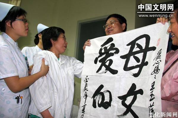 “母女接力,爱的奉献”,学雷锋基金发起人冷宽中将特意为好妈妈王玉萍书写了一副精美书法作品祝福好妈妈早日康复。北京化工大学雷锋精神研究会的师生代表将写满全校师生真情寄语的“感恩母爱,帮好妈妈站起来”红色条幅和日记本亲手送给了好妈妈,转达了全体同学的祝福。乔婷娇将沈阳大学生志愿者街头为好妈妈义卖康乃馨的视频片段播放给好妈妈看。看到这些礼物,玉萍妈妈忍不住又哭又笑,激动地说,“我是唱着学习雷锋好榜样的歌曲长大的,这些礼物太珍贵了,我要把大家对我的爱永远珍藏在心底。”