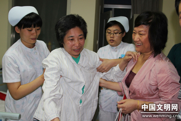 6月28日晚,王玉萍在医护人员搀扶下能站起来了!当日,本网记者、乔安山的孙女乔婷娇、中国学雷锋基金管委会代表、北京化工大学雷锋精神研究会师生代表等看望泰安好妈妈王玉萍。中国文明网张青玲摄