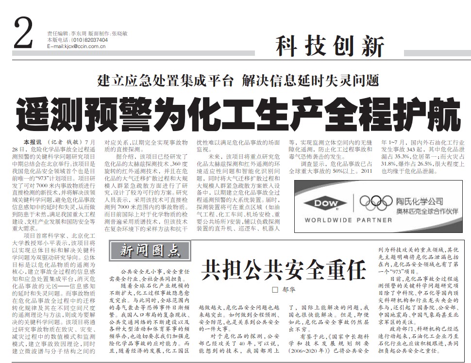 本报讯 (记者 钱敏)7月28日,危险化学品事故全过程遥测预警的关键科学问题研究项目中期总结会在北京举行。该项目是我国危化品安全领域首个也是目前唯一的“973”计划项目。项目研发了可对7000米内事故物质进行直接检测的新技术,并将解决该领域关键科学问题,避免危化品事故信息感知中的延时和失灵,从而做到防患于未然,满足我国重大工程建设、支柱产业发展和国防安全等重大需求。