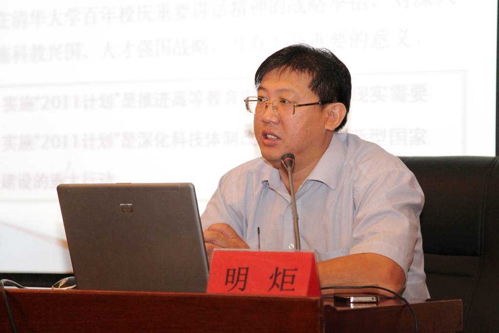 教育部科技司基础处处长明炬受邀为我校领导干部作了关于《高等学校创新能力提升计划》(以下简称“2011计划”)的专题辅导报告。明炬处长介绍了“2011计划”出台的背景、重大意义、主要内容和实施要求,并对“2011计划”实施过程中的具体操作问题作详细说明。他强调,学校要在深入开展需求分析的基础上,抓住顶层设计这个关键,进一步加强制度体系建设,扎实推进“2011计划”培育组建工作。