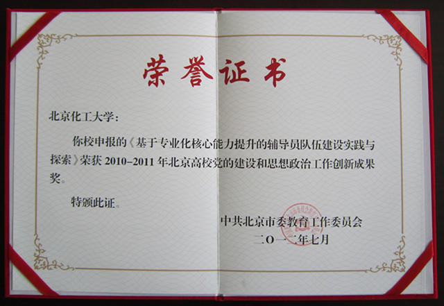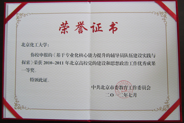 近日,我校在北京市委教育工委举办的2010-2011年北京高校党的建设与思想政治工作优秀成果、创新成果评选中喜获两个奖项,我校申报的《基于专业化核心能力提升的辅导员队伍建设实践与探索》荣获2010-2011年北京高校党的建设与思想政治工作优秀成果一等奖,该成果同时获得2010-2011年北京高校党的建设与思想政治工作创新成果奖。
