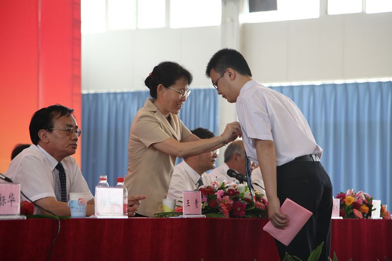 现场举行了全体研究生佩戴校徽仪式,党委书记王芳为新生代表佩戴校徽。