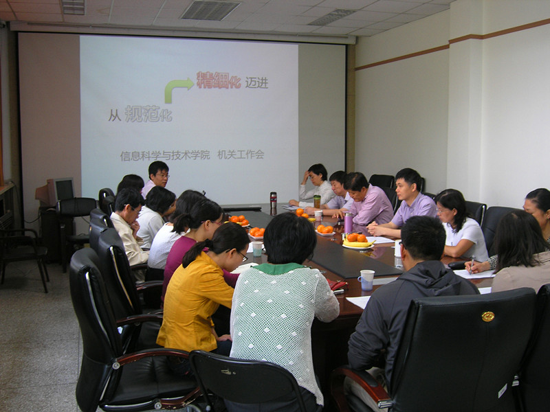 学院李征书记从管理科学的角度做了“从规范化向精细化迈进”的主题报告。他指出,规范化是提高管理水平的基础,规范化依托于制度化建设,但制度化不代表规范化。规划化建设需要公开透明、上下认同、系统完整、行之有效。大家要在具体工作开展中提高工作认识,增强服务意识,依托学校OA办公系统,使得学院办公信息化、工作透明化。他强调以后机关工作要向精细化迈进,要专注细节管理、流程管理和培养习惯。在机关工作会上,学院同时公布了新制定的《信息学院公文制度》和《信息学院信息报送及发布制度》。