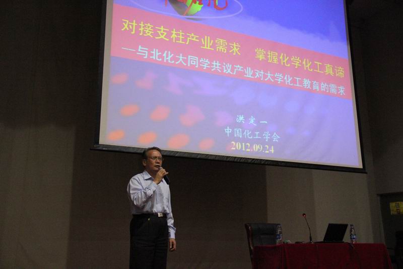 9月24日下午,中国化工学会常务理事洪定一教授在北校区北功厅为广大同学作了题为“对接支柱产业需求,掌握化学化工真谛”的讲座。讲座由教务处副处长苏海佳主持。