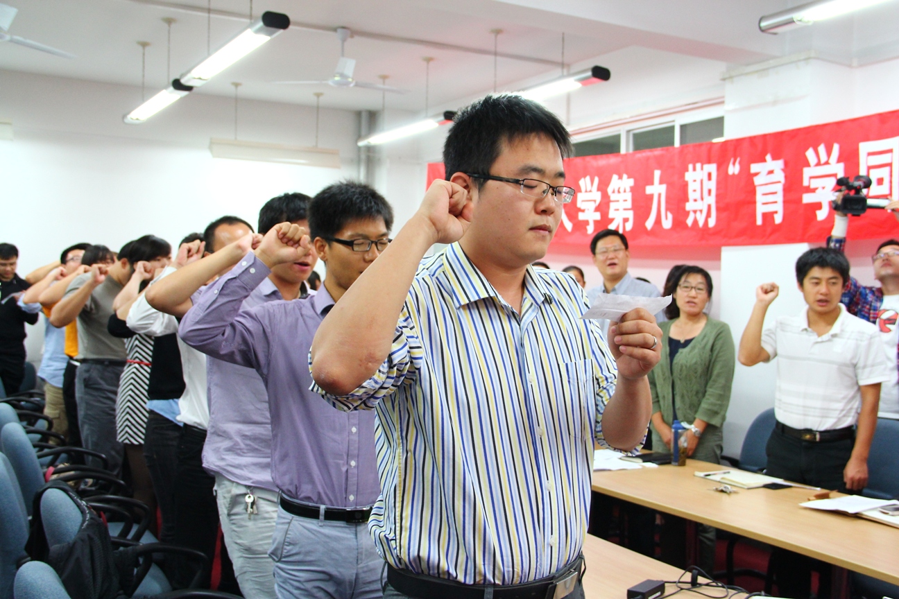 启动仪式上,辅导员代表梁燕亮和解静分别和大家分享了自己在育学同行工程中的收获和成长。随后,大家一起观看了2011级和2012级辅导员团队风采展示。北区办副主任于景华对第八期育学同行工作做了总结,着重突出了“育”出新形式、“学”出新内容、“行”出新成果的三个特色,并宣读了新一期工作组成员名单。学工办主任罗伟为辅导员代表授育学同行旗帜,全体辅导员面向旗帜举行宣誓仪式。