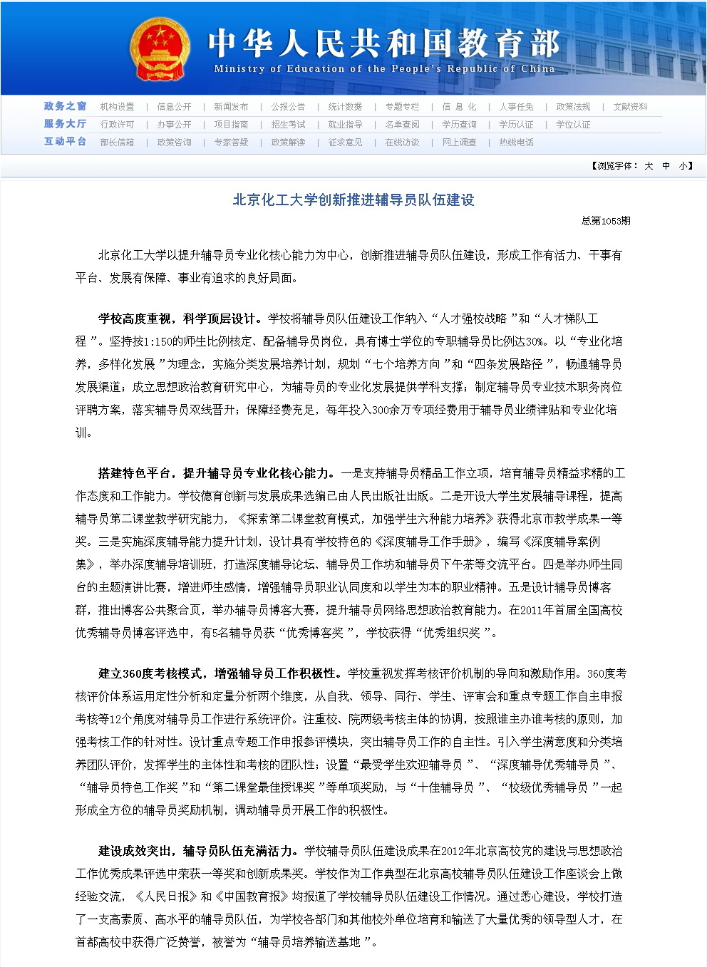 建设成效突出,辅导员队伍充满活力。学校辅导员队伍建设成果在2012年北京高校党的建设与思想政治工作优秀成果评选中荣获一等奖和创新成果奖。学校作为工作典型在北京高校辅导员队伍建设工作座谈会上做经验交流,《人民日报》和《中国教育报》均报道了学校辅导员队伍建设工作情况。通过悉心建设,学校打造了一支高素质、高水平的辅导员队伍,为学校各部门和其他校外单位培育和输送了大量优秀的领导型人才,在首都高校中获得广泛赞誉,被誉为“辅导员培养输送基地”。